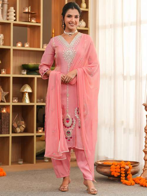 women solid with work three quarter sleeve kurta pant with dupatta set