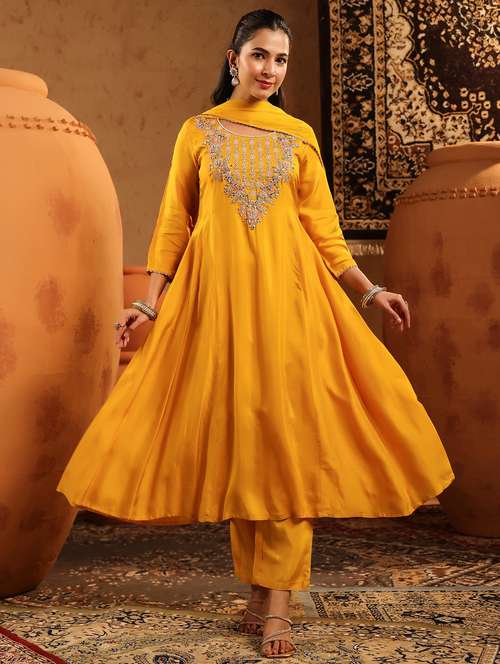 women embroidered long sleeve kurta pant with dupatta set