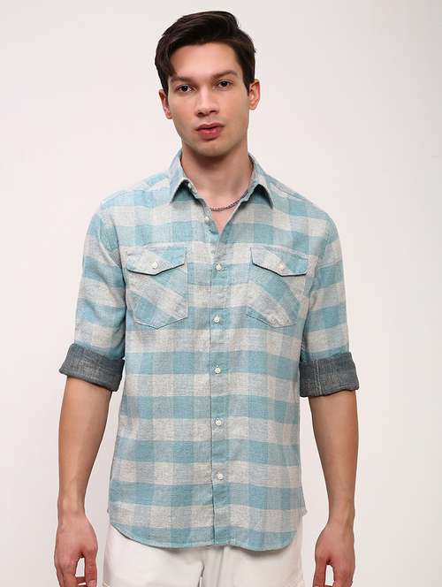 men checkered long sleeves double pockets casual shirt