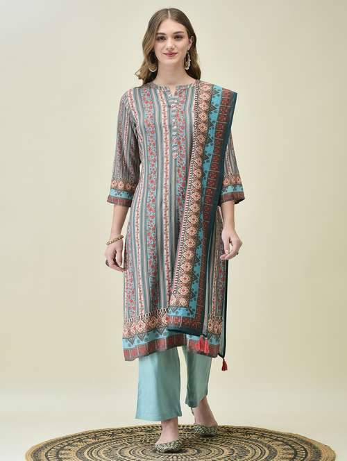 women light blue three quarter sleeve kurta comfort pant dupatta