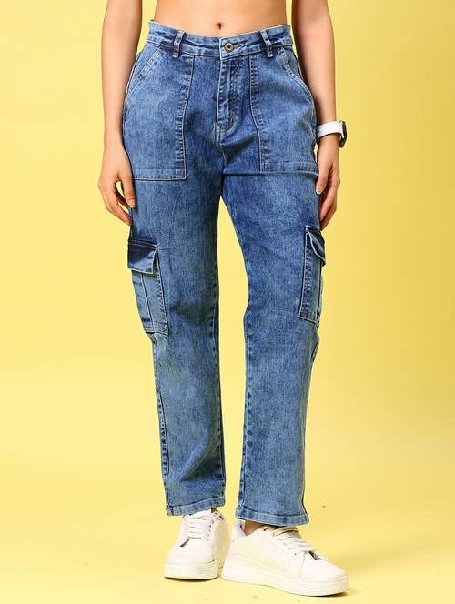 women blue solid mid rise regular fit cargo
