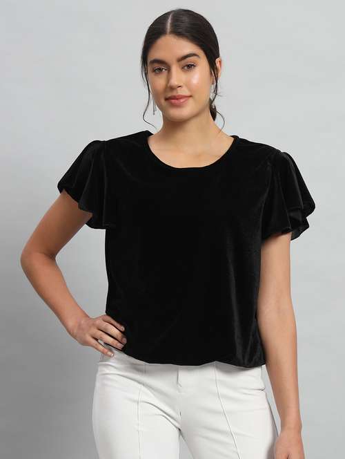 women solid flute sleeve velvet regular top