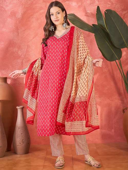 women printed three quarter sleeve kurta pant with dupatta set