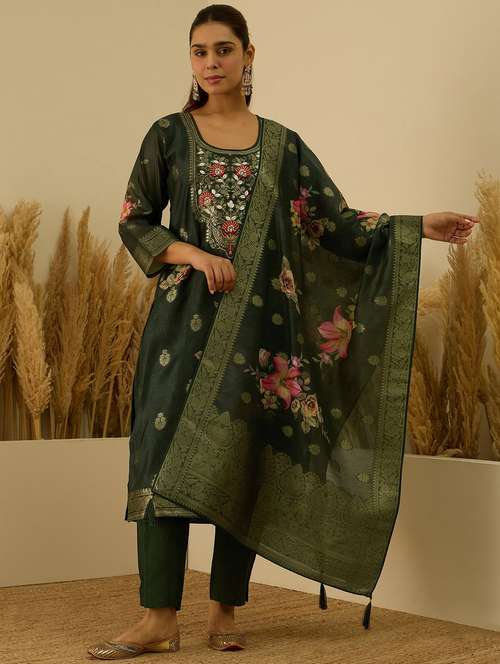 women solid with work three quarter sleeve kurta pant with dupatta set