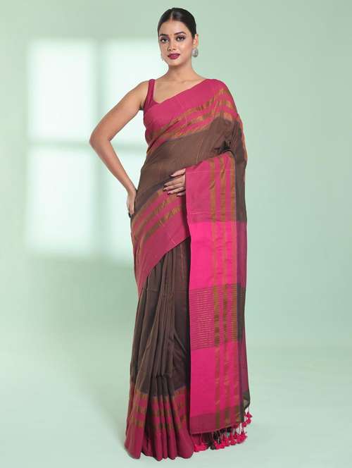 Look royal and loving in this brown handwoven cotton handloom saree. It has woven designs and patterns for a beautiful look.