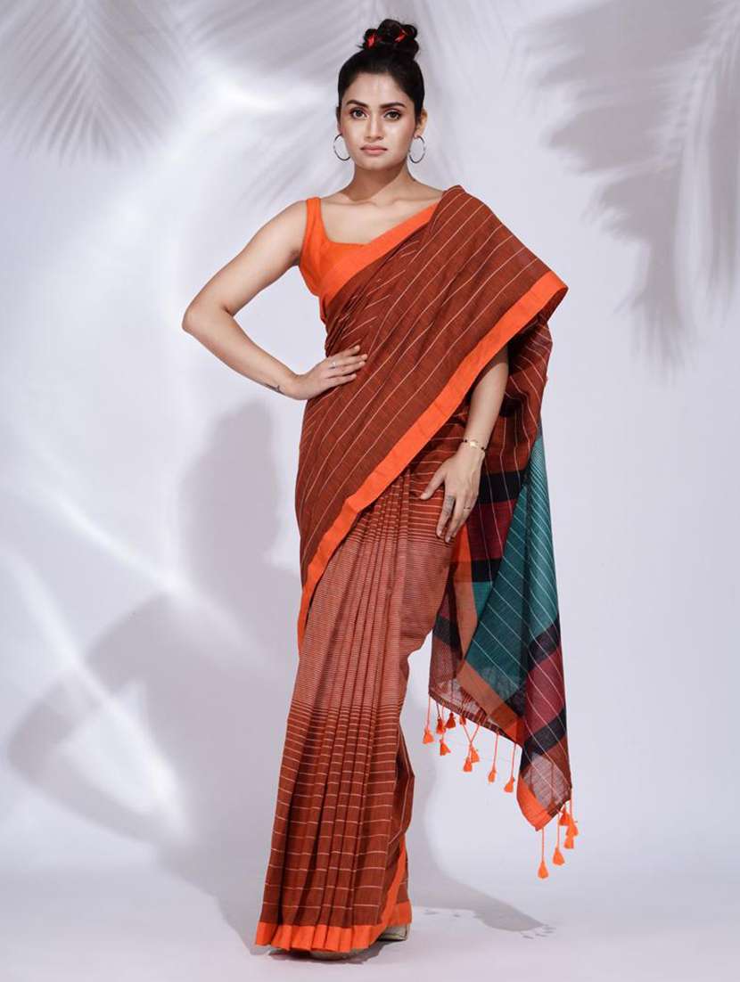 Look glamorous and alluring in this red matka silk handwoven saree. It has plain all over with zari and the borders have geometric patterns.