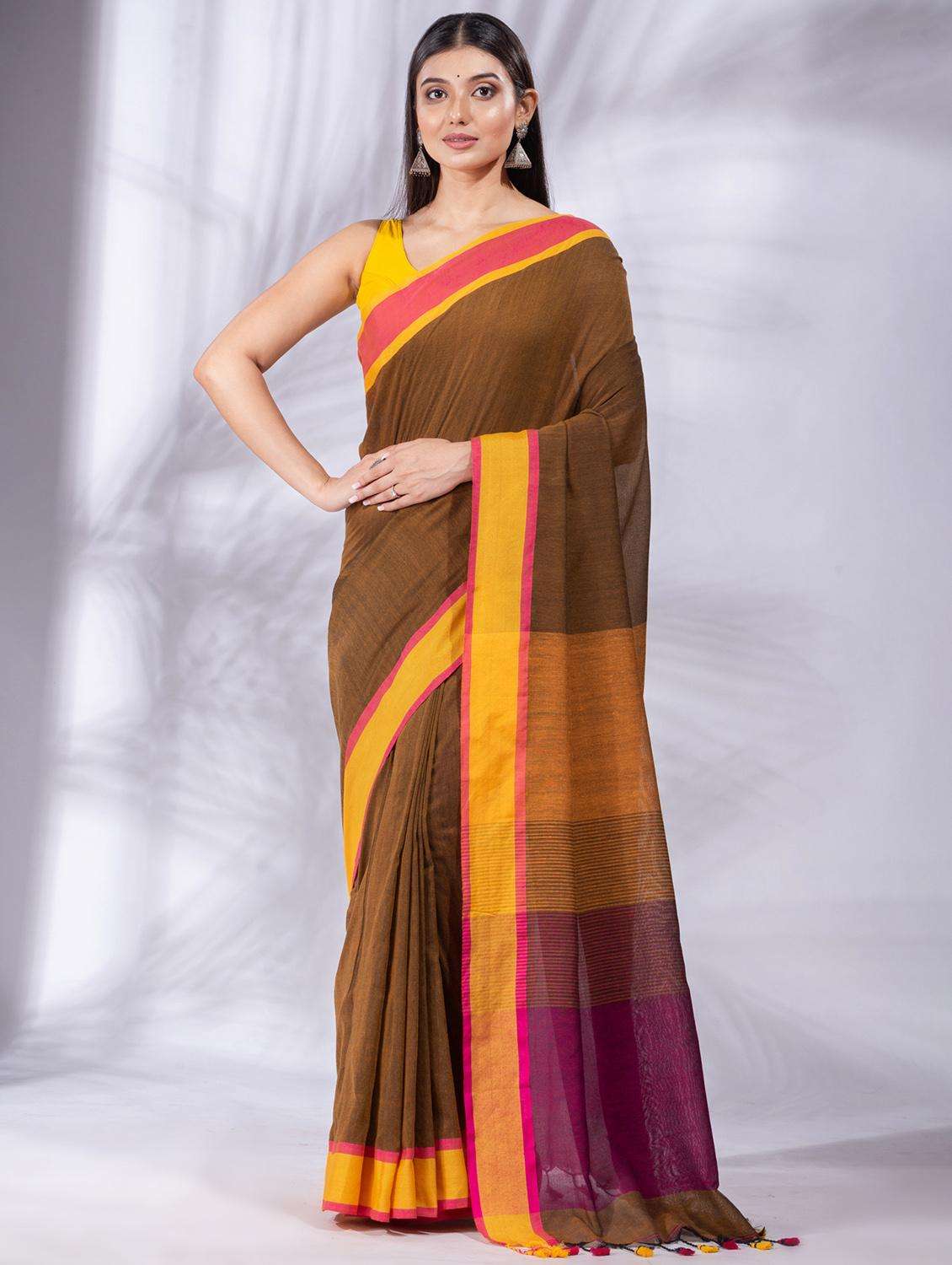 This is Brown Pure Cotton Woven Design soft Saree with multicolor pallu From Charukriti
