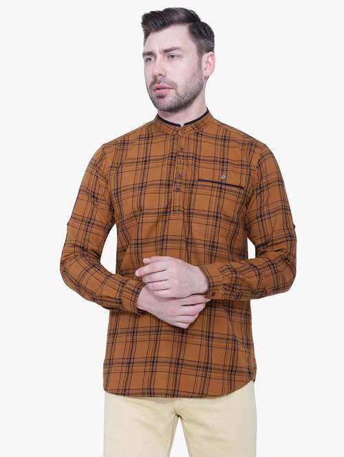 Upgrade your everyday ethnic wardrobe with this brown indigo checks cotton twill short kurta—crafted for men who prefer modern styling with a touch of tradition. The breathable cotton twill fabric ensures durability and comfort, while the tailored fit delivers a refined, confident look. The distinctive checkered pattern in earthy brown with indigo accents adds depth and character, making it a standout piece for casual outings, relaxed gatherings, or smart daywear. Designed with a functional patch pocket and clean detailing, this kurta balances practicality with contemporary style. Effortlessly versatile and stylish, it’s a perfect choice for men who like their ethnic wear modern, comfortable, and distinctive.