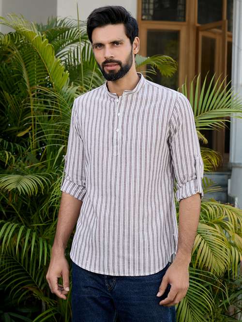Woven Striped Cotton Short Kurta features a mandarin collar, long sleeves, a curved hem, and side slits for added comfort and style.