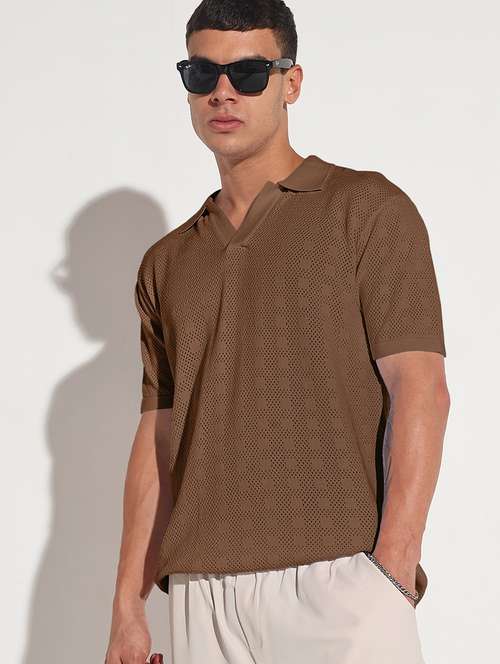 SHOWOFFFF Edition Men's Brown Polo Collar Regular Fit Semi Sheer T-Shirt