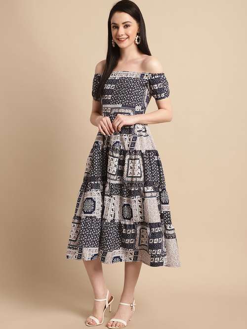 Brown Pejali Printed A-line Dress, has a Off-Shoulder neck, short sleeves, flared hem,