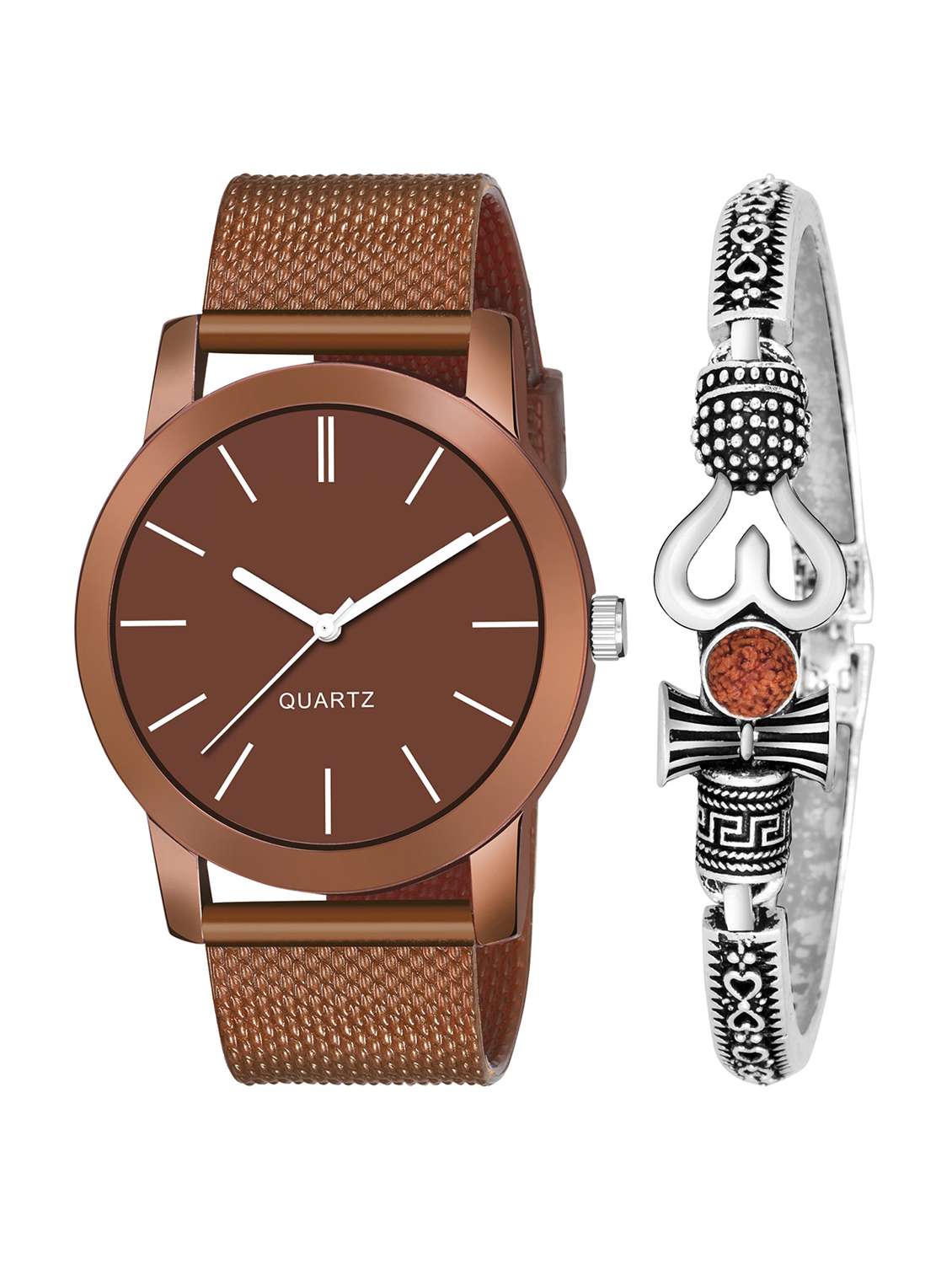 kajaru new fancy stylish - brown pu strap & mahadev bracelet combo watch