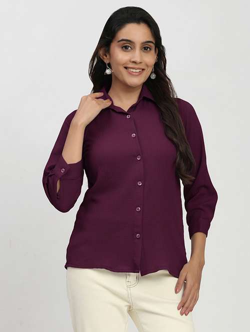 Refresh your wardrobe with this solid burgundy 3/4th sleeve shirt. The cuffed design adds structure with a stylish edge. Crafted from soft fabric for all-day comfort. Ideal for office, dinner, or casual wear.