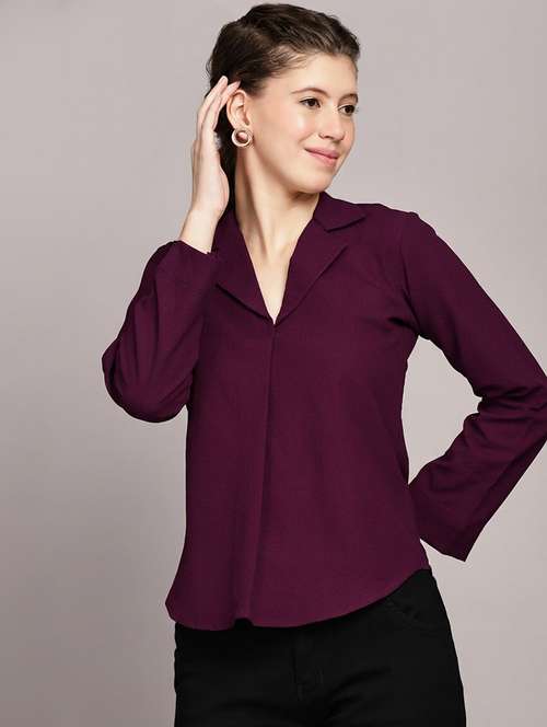 Elevate your workwear with this burgundy V-neck pleated top from TrendRush. Designed with full sleeves and a neat silhouette for a polished look. Crafted in soft, breathable fabric for day-long comfort. Perfect for office meetings, presentations, and formal events.