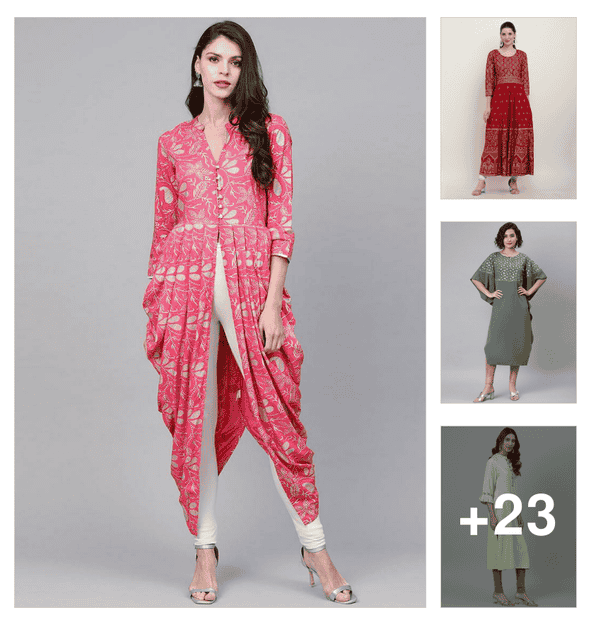 - Tail cut Kurta: Tail cut kurta with layered pattern is trending for parties and eves. It is short from one side and has a tail like effect on the other side. Tail cut kurta is the best stylish and trendy option for young Indian girls & women.