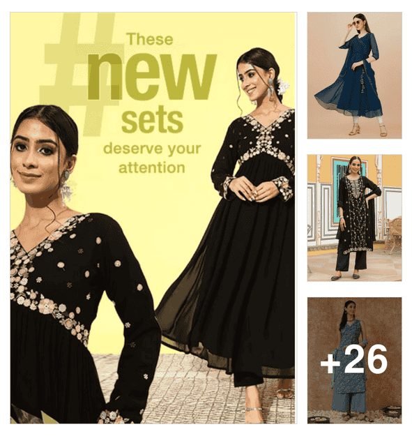 globus women black scalloped hem bell sleeves floral embroidered kurta & straight pant festive set
