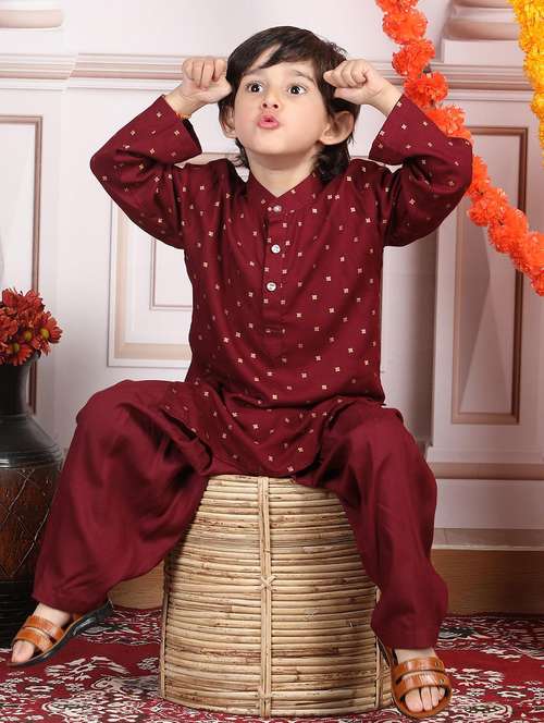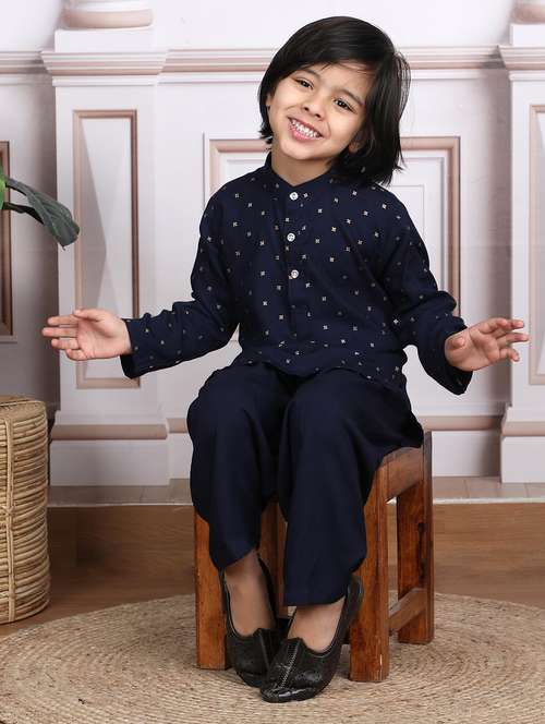 • Shop for kurtas and kurta sets for boys with crisp neck styles, lengths, and offbeat eccentric patterns that he will love to wear.