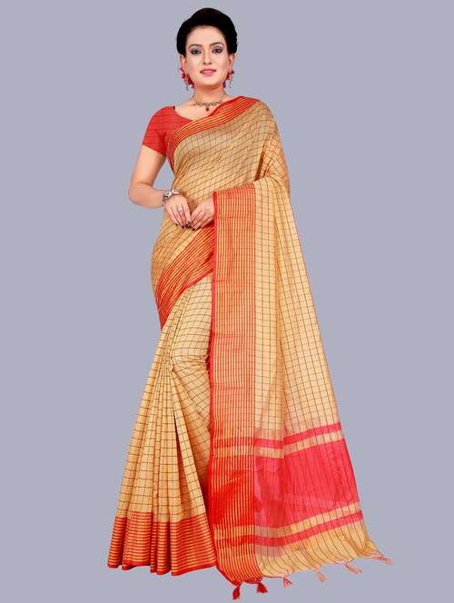 - » cream checkered woven saree with blouse