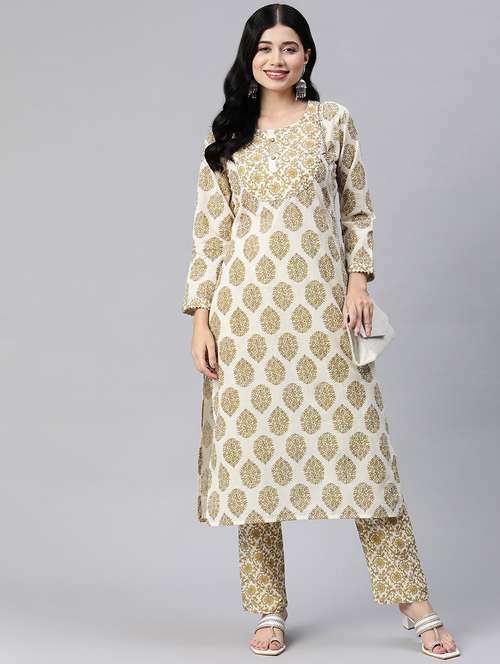 - Find gorgeous sets of ethnic wears in trending designs in cream colors suitable for festive wear of occasions.