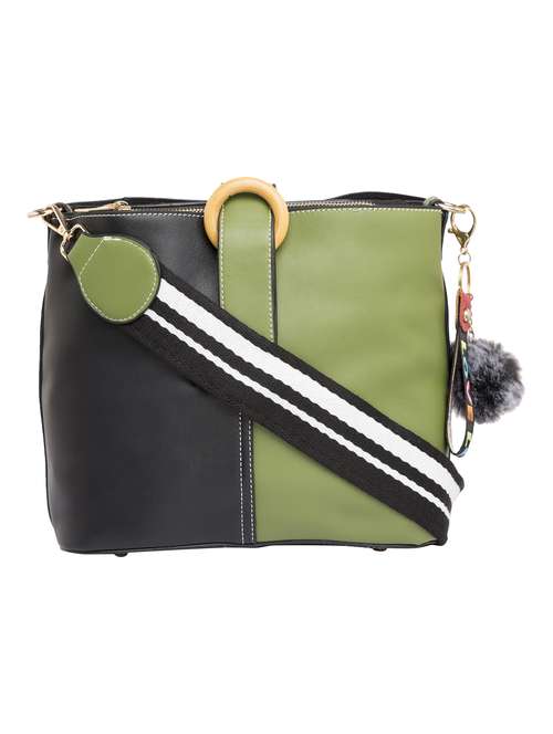Green and Black Colored Soft PU Leather Handbag / Shoulder Bag. Light Weight. Stylish and Spacious enough to carry your Daily essentials. It has an Adjustable Strap. 3 Compartments - 2 with Magnet Lock Closure and 1 with Zip Closure, 2 small inner pockets and 1 inner zip pocket. Removeable Sling Strap. Good Material for daily wear and tear.