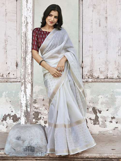 Soft kota saree with zari woven borders. Zari woven butties allover in between gap border. Cotton tassles on pallu. Contrast crape silk ajrakh printed blouse.