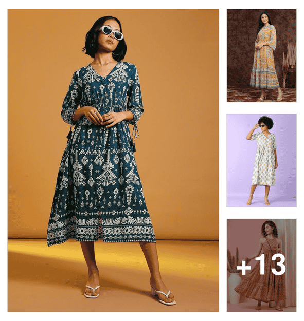 globus women blue ethnic block print mandarin collar flared hem tiered maxi fusion dress