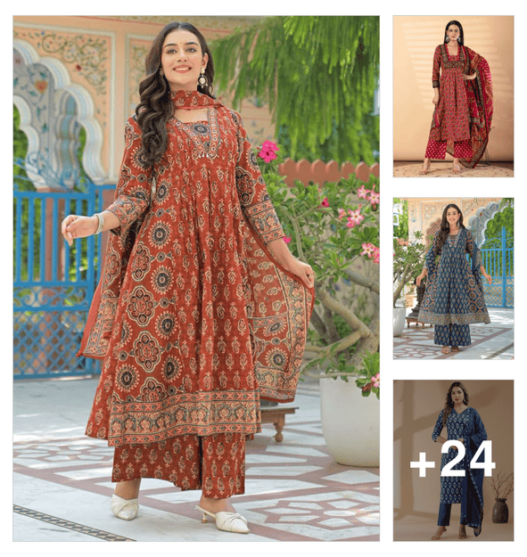globus women maroon embroidered v-neck allover gold foil printed anarkali kurta with narrow pants festive set