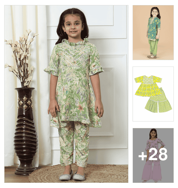 girls printed three quarter sleeve kurta and pant set