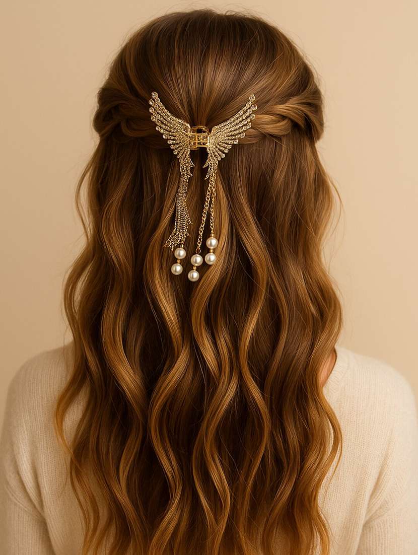 Premium Gold Wing Design Hair Claw with Rhinestones and Pearl Dangling Chains