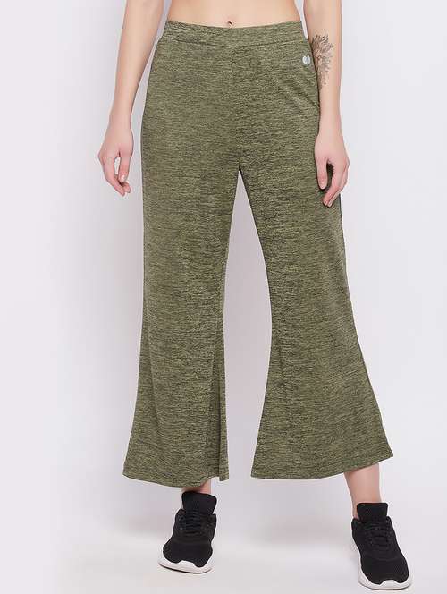 Green melange flared yoga pants crafted with 100% polyester fabric.Engineered with 4-way stretch fabric that moves with your movement.Quick Dry Technology helps wick away sweat during an intense workout routine, keeping you cool dry.Crafted with anti-static property to stop the tights from clinging to your body.Has great elasticity, is resistant to perspiration, and is comfortable.Has elastic enclosed in a soft fabric for extra tummy support.Designed with reflective logo on one side.Maximises flexibility, mobility performance.Perfect for cycling, running, Zumba, etc.