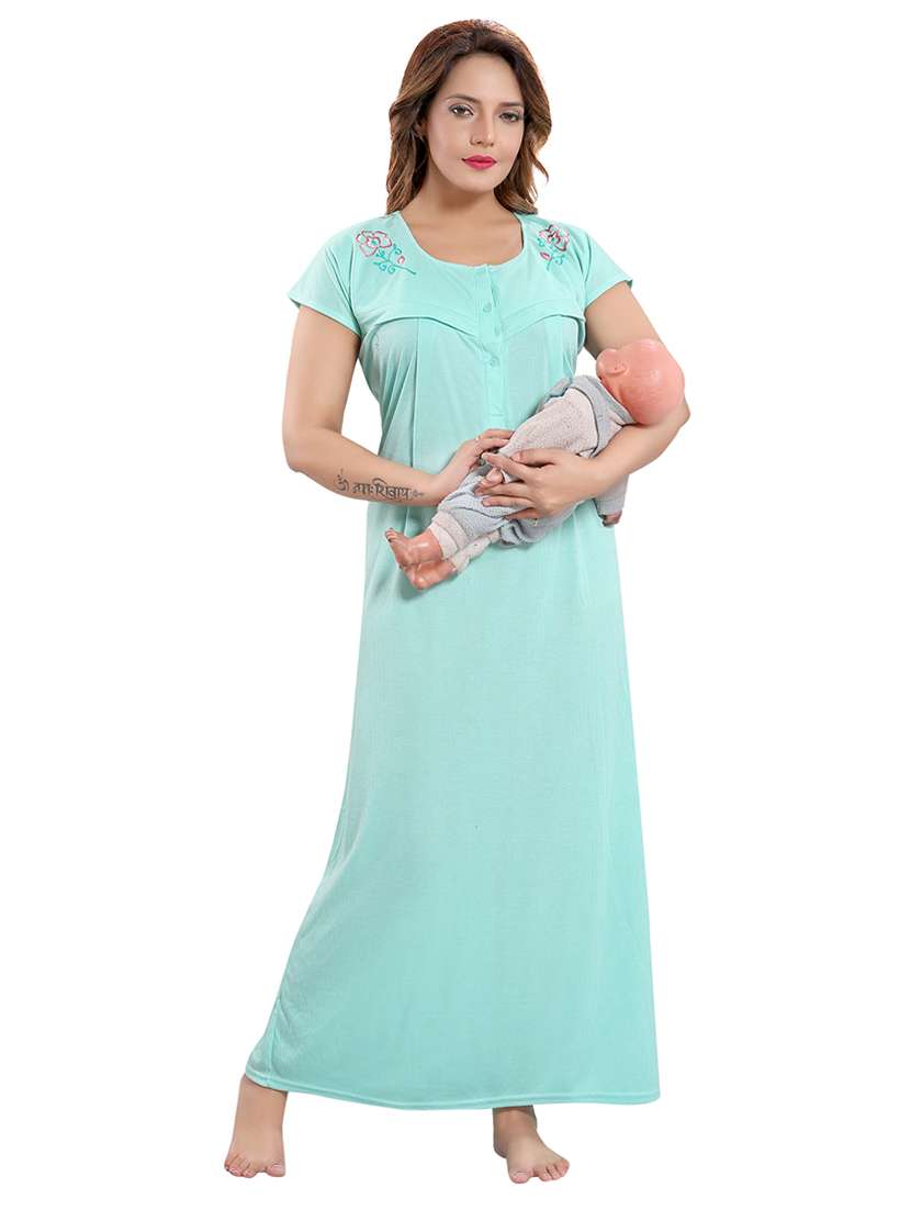 Make your feeding session relax & comfortable with this Maternity Gown for Feeding. Made up of Cotton. This striped nightgown has zipper on both side for feeding purpose, button & embroidery details, short sleeves & Round Neck. This Nighty is the ultimate blend of comfort and style. br Length Full (approx-56 inches) br Size-Free (comfort fit to bust 32-38 inches) br Sales Package: 1 Maternity Gown