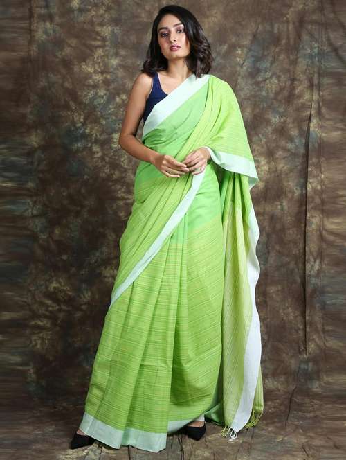 This is Allover Stripes Light Green Handloom Saree With Unstitched Blouse from Charukriti