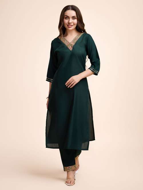 - Find gorgeous sets of ethnic wears in trending designs in green colors suitable for work wear of occasions.