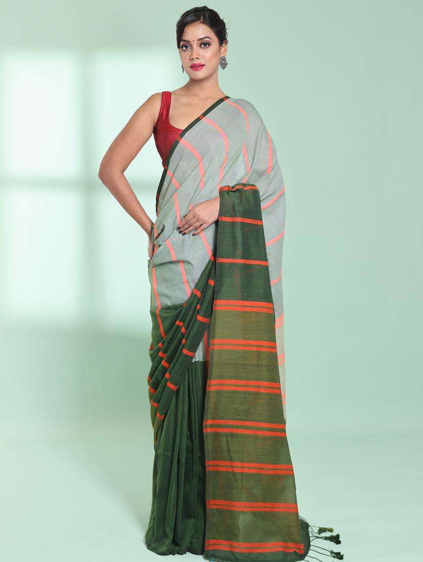 Look royal and loving in this green handwoven cotton handloom saree. It has woven designs and patterns for a beautiful look.