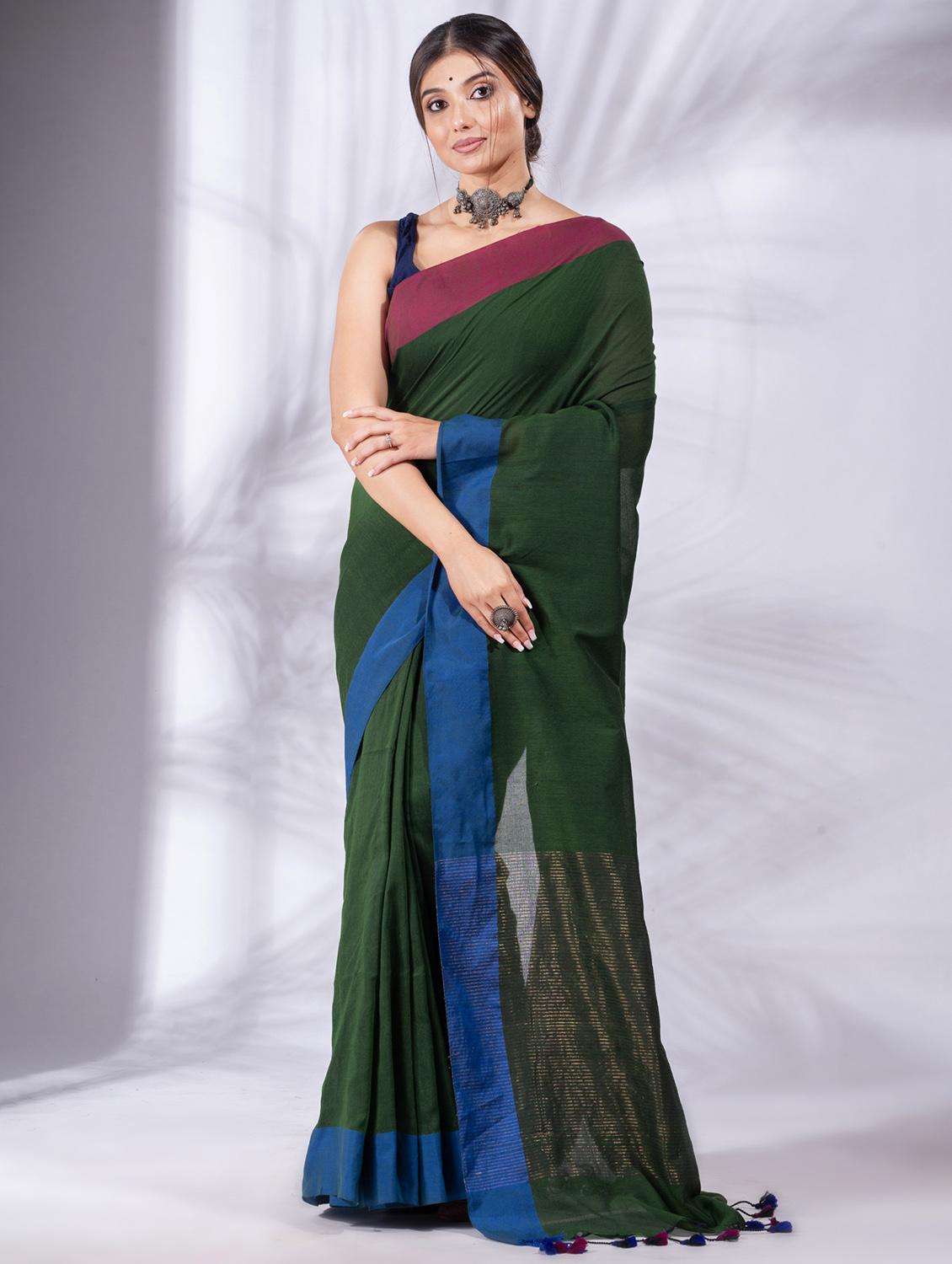 This is Green Pure Cotton handwoven soft Saree with zari border From Charukriti