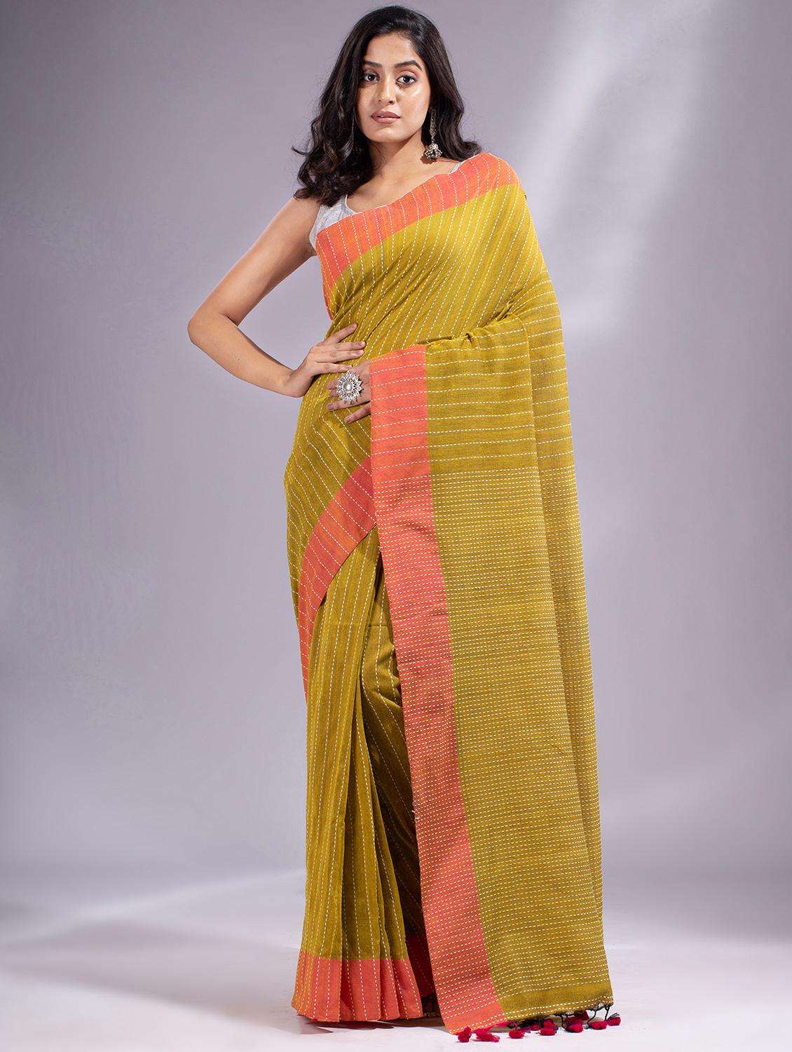 This is Lime Green Cotton handwoven soft Saree with zari pallu From Charukriti