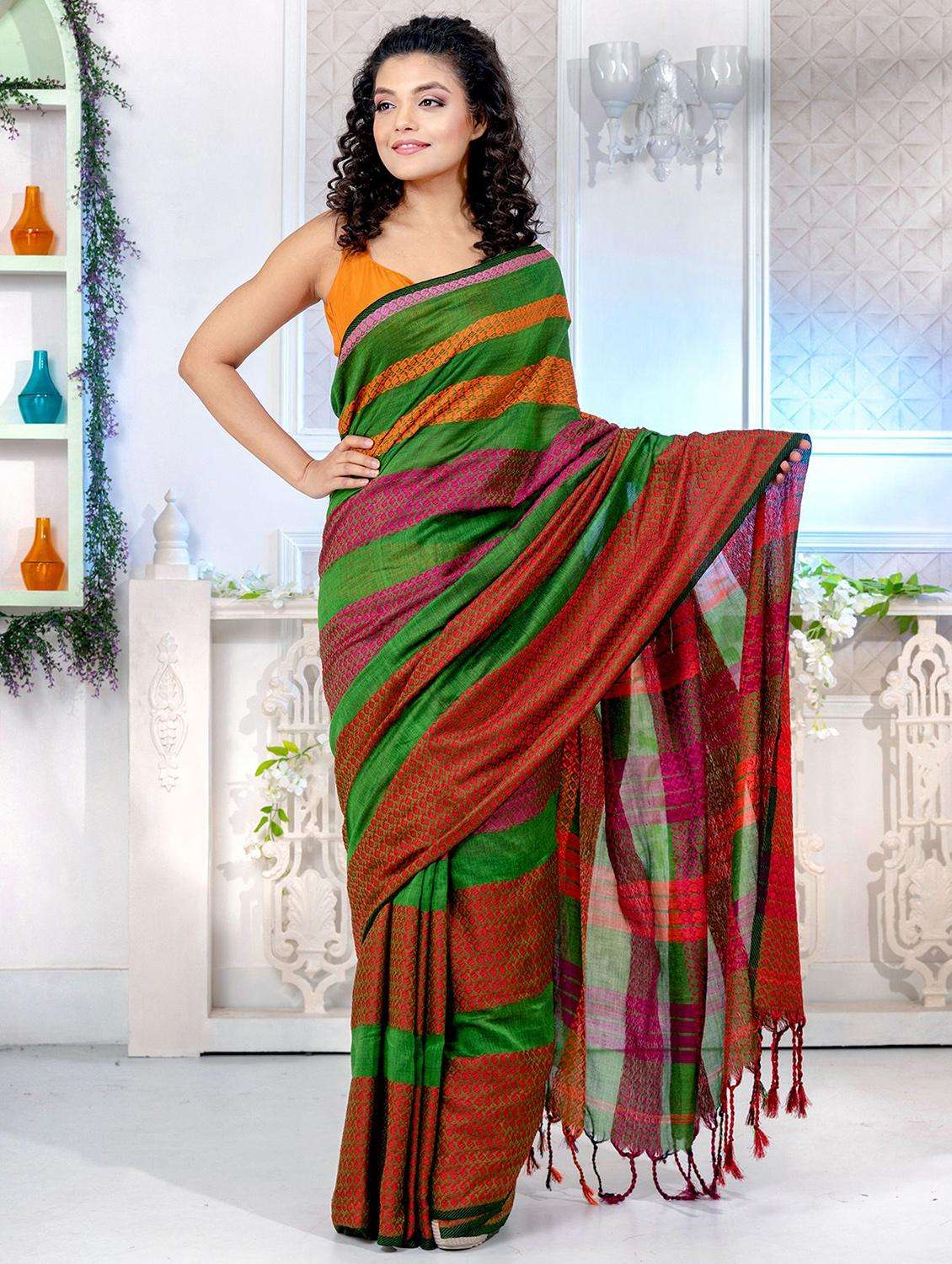 This is Green Pure Cotton handwoven soft begumpuri saree from Charukriti