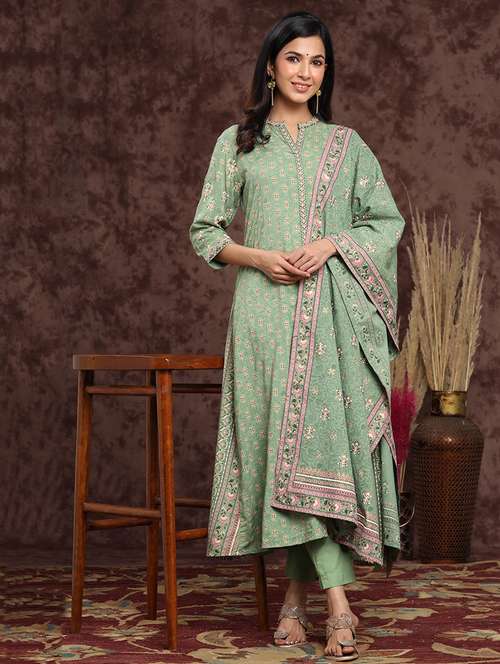 - Find gorgeous sets of ethnic wears in trending designs in green colors suitable for casual wear of occasions.