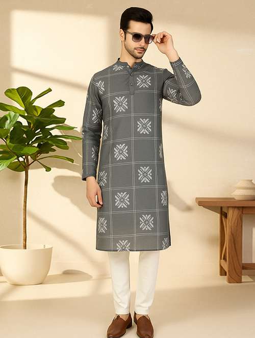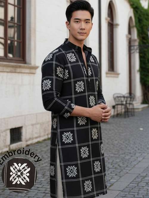 Rigo presents Men’s Embroidered Kurta, designed with a drop shoulder silhouette and a slightly loose fit for relaxed sophistication. The kurta features intricate embroidery work on vertical stripes, giving it a handcrafted and contemporary appeal. Fabric-covered buttons add a premium touch, complementing the overall aesthetic. Made from soft, breathable cotton-blend fabric, this kurta ensures all-day comfort while keeping you stylish during festivals, family functions, or casual evenings. Pair it with white churidar or straight pants to complete the elegant ethnic look.