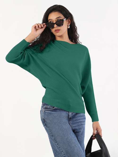 SHOWOFFFF Women's Ribbed Green Batwing-Sleeve Pullover Top
