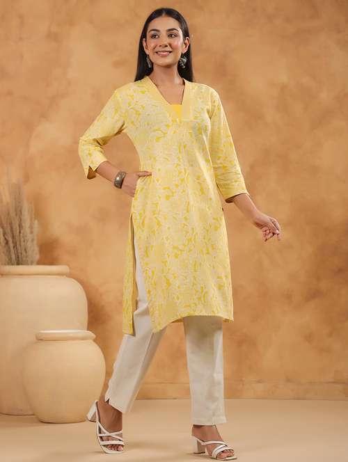 - Grab this beautiful kurta made up of cotton fabric featuring round neck designs.
