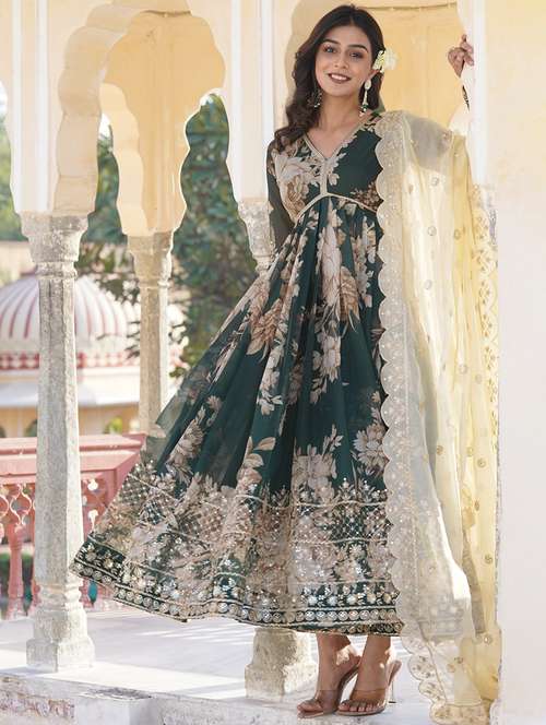 - Find gorgeous sets of ethnic wears in trending designs in green colors suitable for festive wear of occasions.