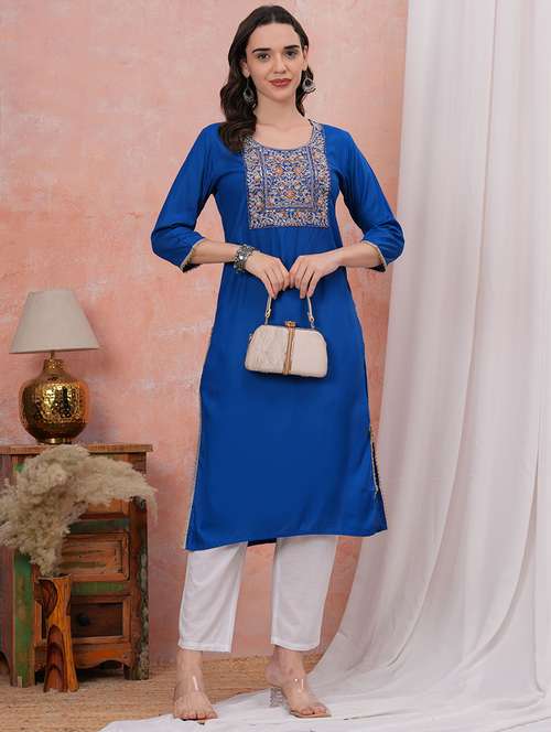 - Grab this beautiful kurta made up of rayon fabric featuring round neck designs.