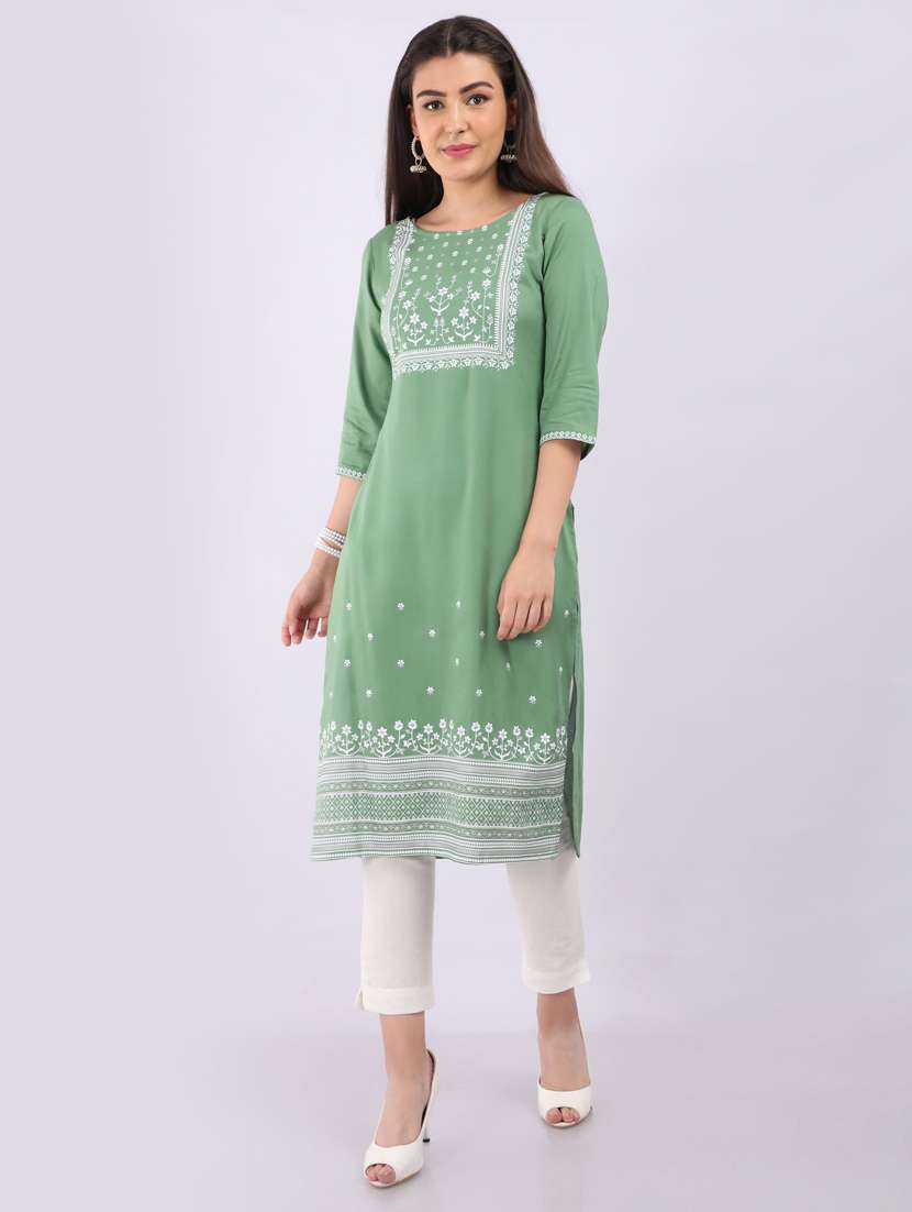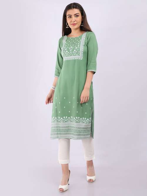 • Grab this beautiful kurta made up of rayon fabric featuring round neck designs.