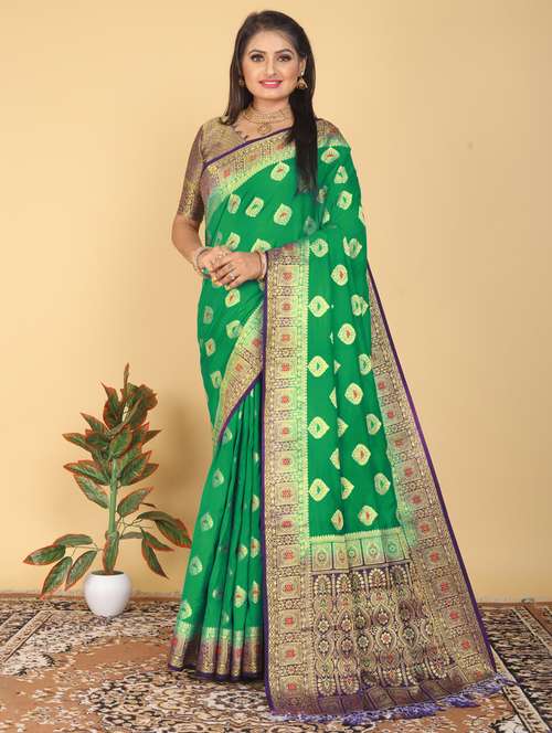 Green & Purple Dola Silk Saree with Rich Gold Zari Weaving – Party Wear Saree with Contrast Border & Blouse