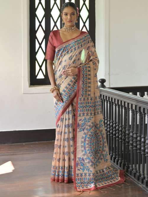 This exquisite saree is crafted from soft Tussar silk fabric, adorned with mesmerizing Madhubani prints that celebrate India's rich heritage. The traditional printed pallu adds a touch of elegance, while the fancy tassels bring a contemporary flair. The contrast blouse piece completes the ensemble, allowing for a personalized touch. This premium quality saree, measuring 6.3 meters, including an 80 cm unstitched blouse piece, is a perfect blend of tradition and modernity.