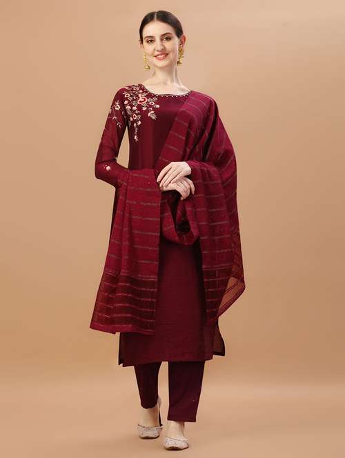 - Browse through the latest range of ethnic sets for women with tailored sleeve designs with embroidered works.