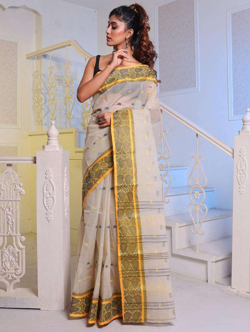 Get your hands on one of the cult favourite ecru pure cotton handwoven tant saree. It has ethnic motifs all over the saree along with pallu. The borders have nakshi patterns woven along the length. The pallu is also highlighted with stripe pattern to compliment the look beautifully.