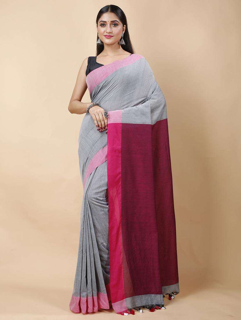 women solid with bordered handloom saree