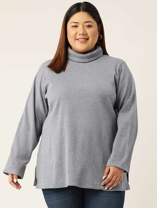 theRebelinme Plus Size Women's Charcoal Grey Solid Color Cotton Knitted Top, has a high neck neck, 3/4th sleeves and flared hem.